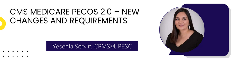 Provider Enrollment Expert Yesenia Servin will help you to understand New Medicare PECOS 2.0 rules and requirement and will discuss about all important elements of PECOS 2.0 step by step. She will also tell the detailed new enrollment and revalidation process, modification on sole proprietors and large practices with multiple locations. She will share the screenshot of each step and process of PECOS 2.0.