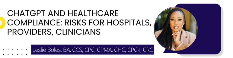 In the era of advanced artificial intelligence, ChatGPT has emerged as a powerful tool that holds immense potential for transforming healthcare interactions. However, alongside the promises of improved patient engagement and streamlined workflows, there lie compliance pitfalls that demand careful attention. Join us for an insightful webinar as we dive deep into the compliance pitfalls associated with ChatGPT in the healthcare industry led by industry experts well-versed in healthcare compliance and AI technologies, Leslie Boles, BA, CCS, CPC, CPMA, CHC, CPC-I, CRC. This webinar aims to provide attendees with a comprehensive understanding of the compliance risks and challenges involved in utilizing ChatGPT and AI technology.