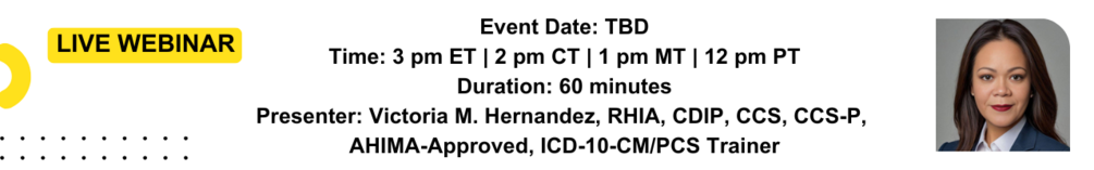 Victoria M. Hernandez, RHIA, CDIP, CCS, CCS-P, AHIMA-Approved, ICD-10-CM/PCS Trainer, is a Registered Health Information Administrator (RHIA), a Clinical Documentation Improvement Practitioner (CDIP), Certified Coding Specialist (CCS), a Certified Coding Specialist Physician-Based (CCS-P) and an AHIMA-Approved ICD-10-CM/PCS Trainer with over 29 years of experience in the healthcare field.
