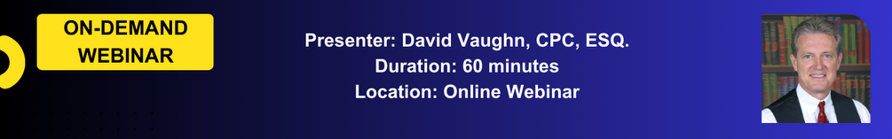 David Vaughn, ESQ., CPC, is an attorney with over 25 years of experience whose practice involves representing healthcare providers around the country regarding billing and healthcare compliance issues. David has also been a certified coder for 25 years. David has previously written articles on the No Surprises Act (“NSA”) and spoken nationally regarding this topic. Over the past 25 years David has been retained to defend healthcare providers in criminal investigations, False Claims Act cases, OIG investigations, FBI investigations, and a myriad of Medicare audits. David and his firm perform internal audits for their own clients to ensure compliant billing.