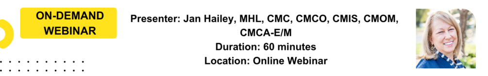 Jan Hailey, MHL, CMC, CMCO, CMIS, CMOM, CMCA-E/M, has more than 30 years of experience in healthcare. She is proficient in administration, coding, and billing roles, and teaches medical office professionals around the country how to excel in their careers. Jan's affinity for teaching has helped countless healthcare providers and medical office professionals over the years. During her expansive career, she has led comprehensive interdisciplinary teams working closely with providers, management, staff, communities, and payers to develop strategies for process improvement, quality gap closures, and patient experience. Jan has a Master of Health Leadership degree and five professional certifications in office management, coding, insurance processing, auditing, and compliance. She is a WPS Government Health Administrators (Medicare) Provider Outreach and Advisory Group member and has also been instrumental in developing Practice Management Institute’s Workforce Initiatives program.
