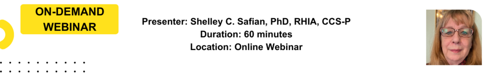 Dr. Shelley C. Safian, PhD, RHIA, CCS-P, has been teaching Health Care Administration, Health Information/ Informatics Management, and Medical Billing and Coding, both onsite and online, for more than 20 years. She has a PhD in Health Care Administration and master’s in organizational management/ health care administration/ health informatics.