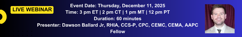 Dawson Ballard Jr. is a healthcare coding expert and educator with over 20 years of experience in medical coding, auditing, and education. He specializes in CPT, ICD-10-CM, and HCPCS coding across a variety of specialties, including OBGYN, family practice, and internal medicine. Dawson has held positions such as Coding Auditor & Educator at Rush University Medical Center, Audit & Compliance Specialist at LMH Health, and Risk Adjustment Coding Auditor at Blue Cross and Blue Shield of Kansas City. He holds multiple industry credentials, including Registered Health Information Administrator (RHIA), Certified Coding Specialist – Physician Based (CCS-P), Certified Professional Coder (CPC), and Certified Professional Medical Auditor (CPMA). Dawson is recognized as an AAPC Fellow and actively contributes to professional associations, having served as a local chapter officer, speaker, and published author on medical coding topics.